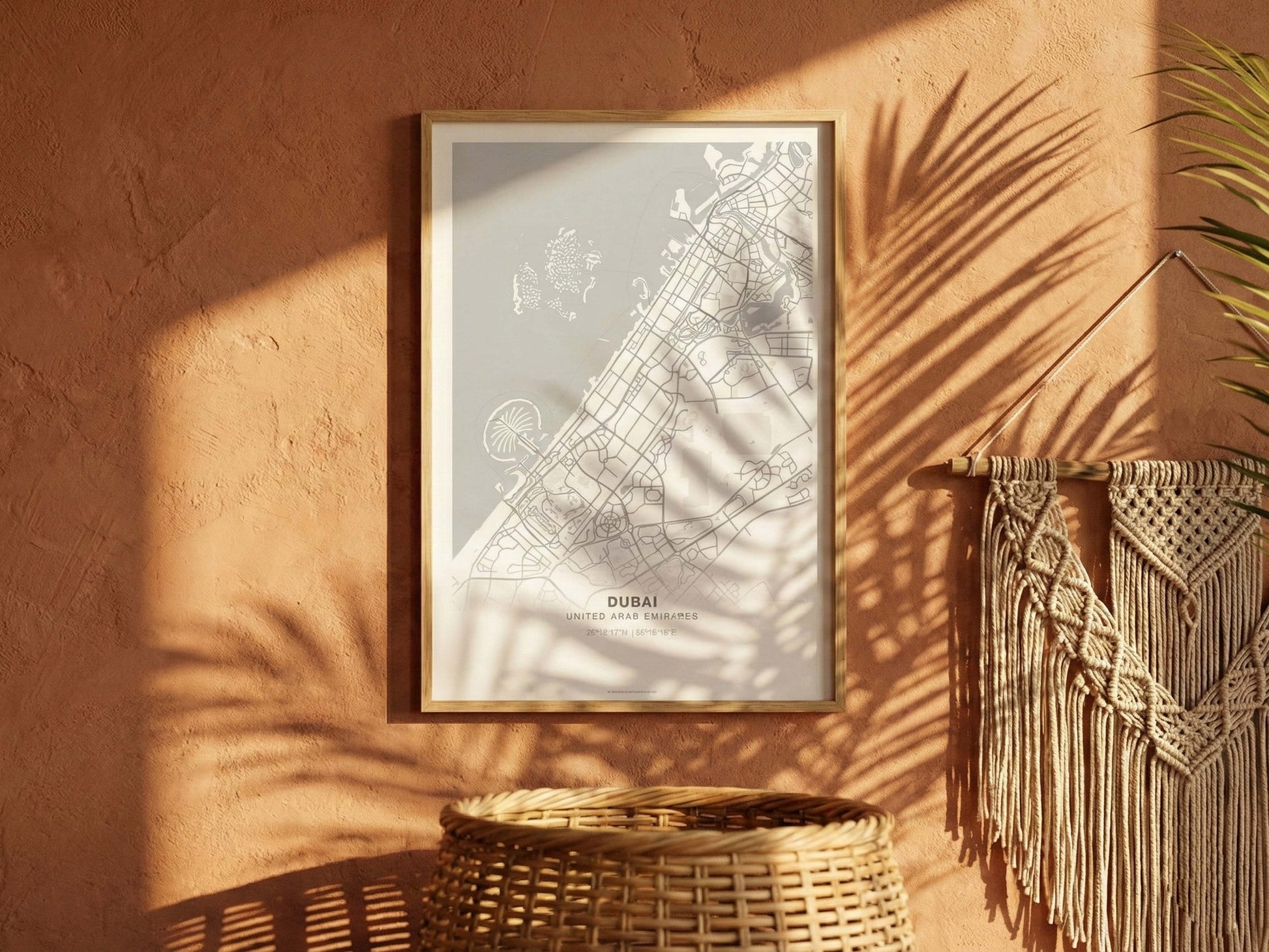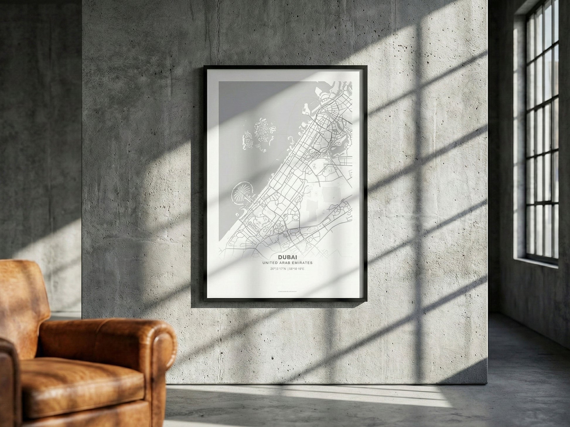 Modern, titizlikle tasarlanmış bir Dubai haritası — temiz çizgileri, dengeyi ve zarafeti önemseyen mekânlar için üretildi.
