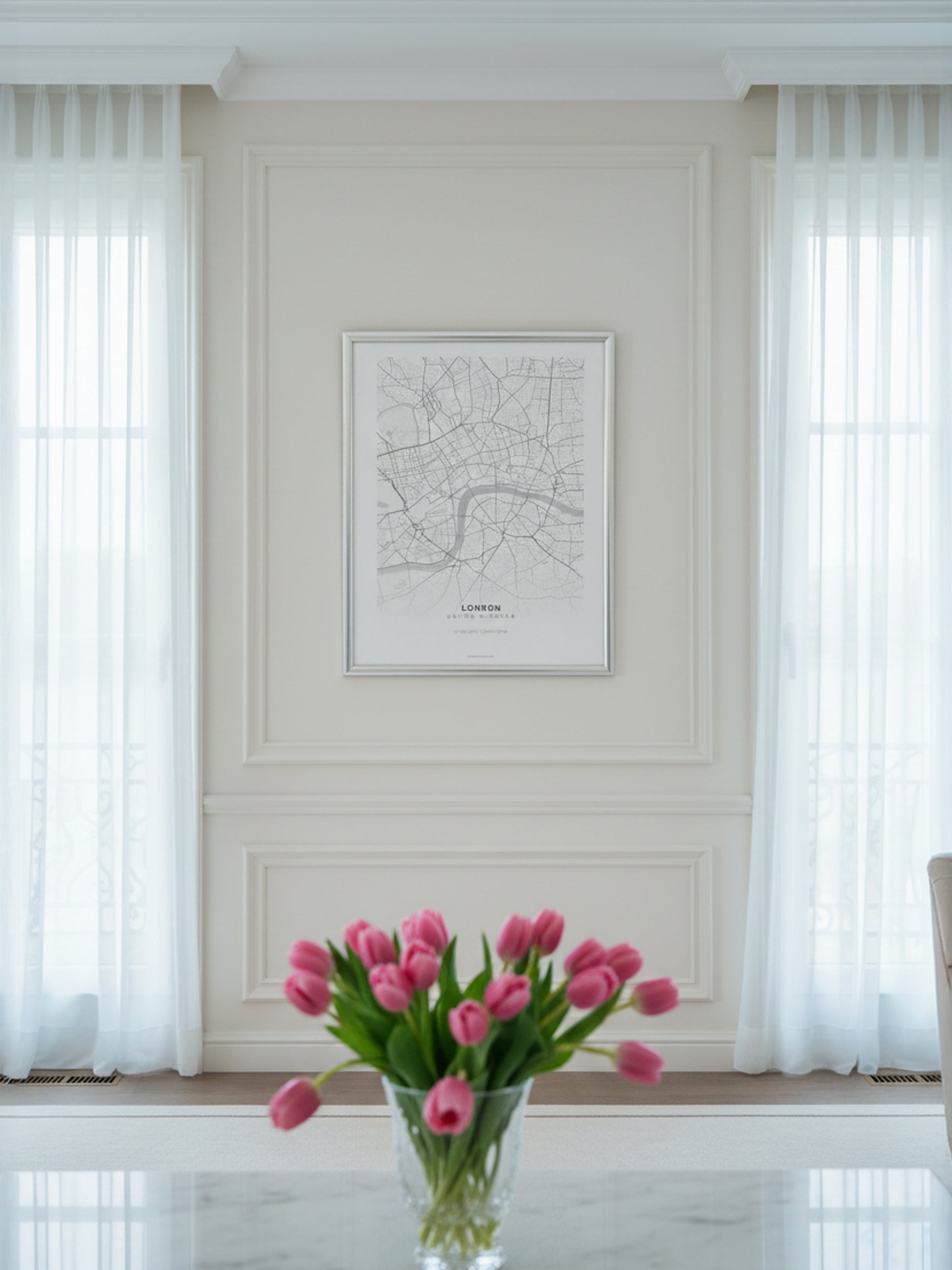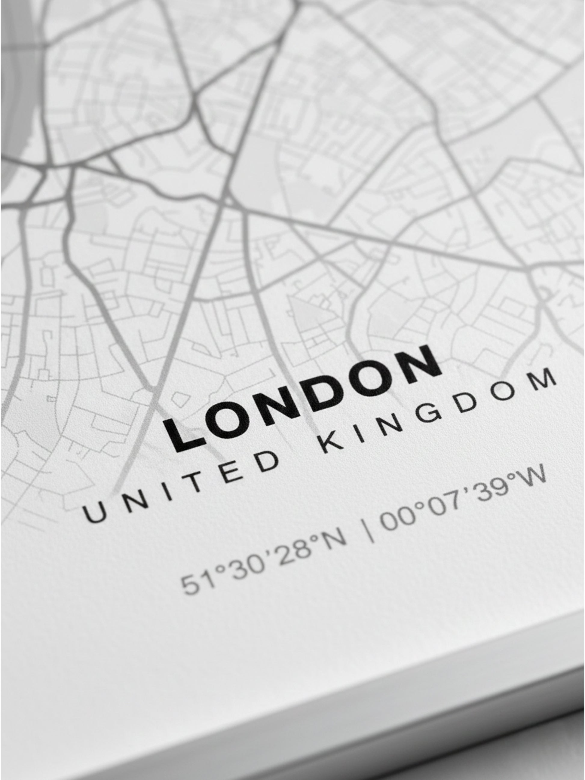 Londra’nın modern ve özenle tasarlanmış bir haritası — temiz çizgiler, denge ve zarafeti önemseyen iç mekânlar için üretildi.